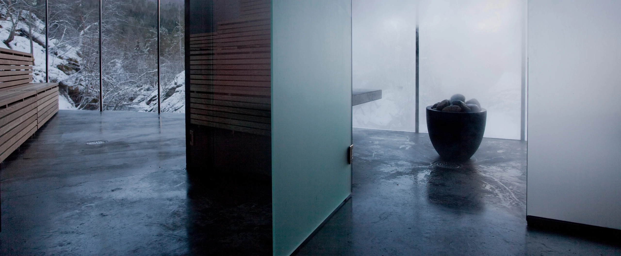 Find your freedom and recline after a skiing trip or walk – or perhaps after a long journey. The spa area itself is held in dark concrete, but the small rooms are painted in beautiful colours to enhance the impression of being in a cave.