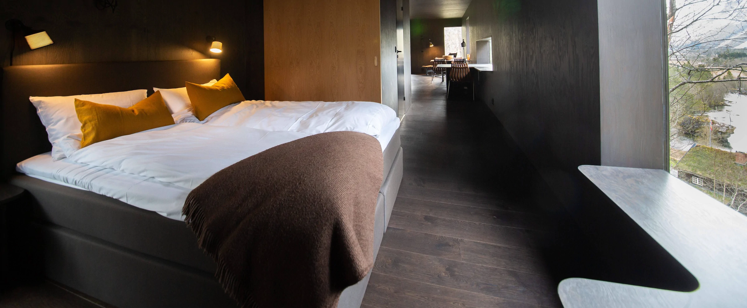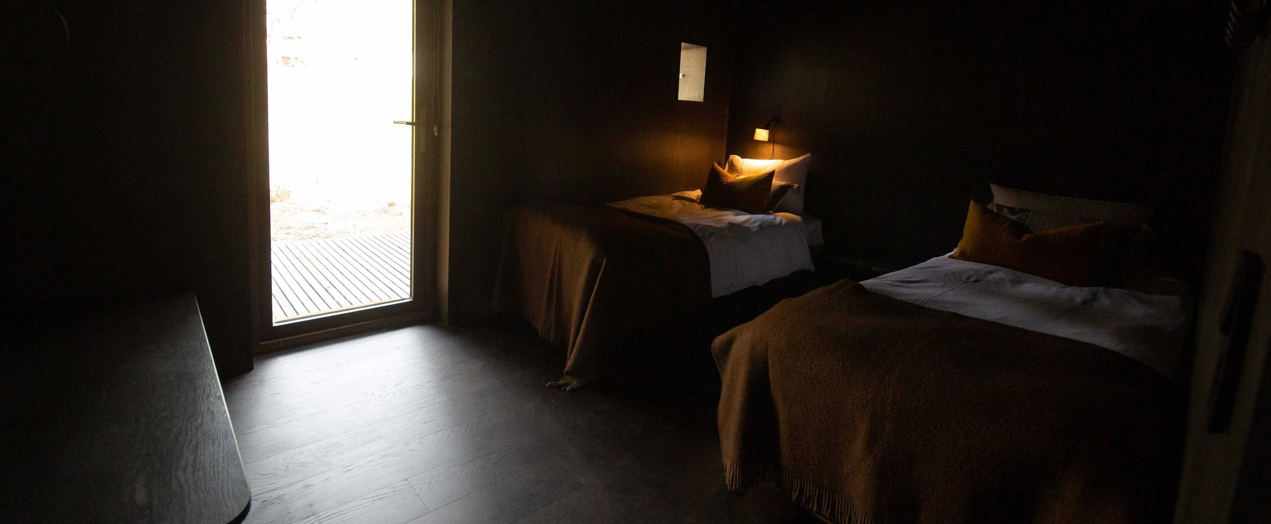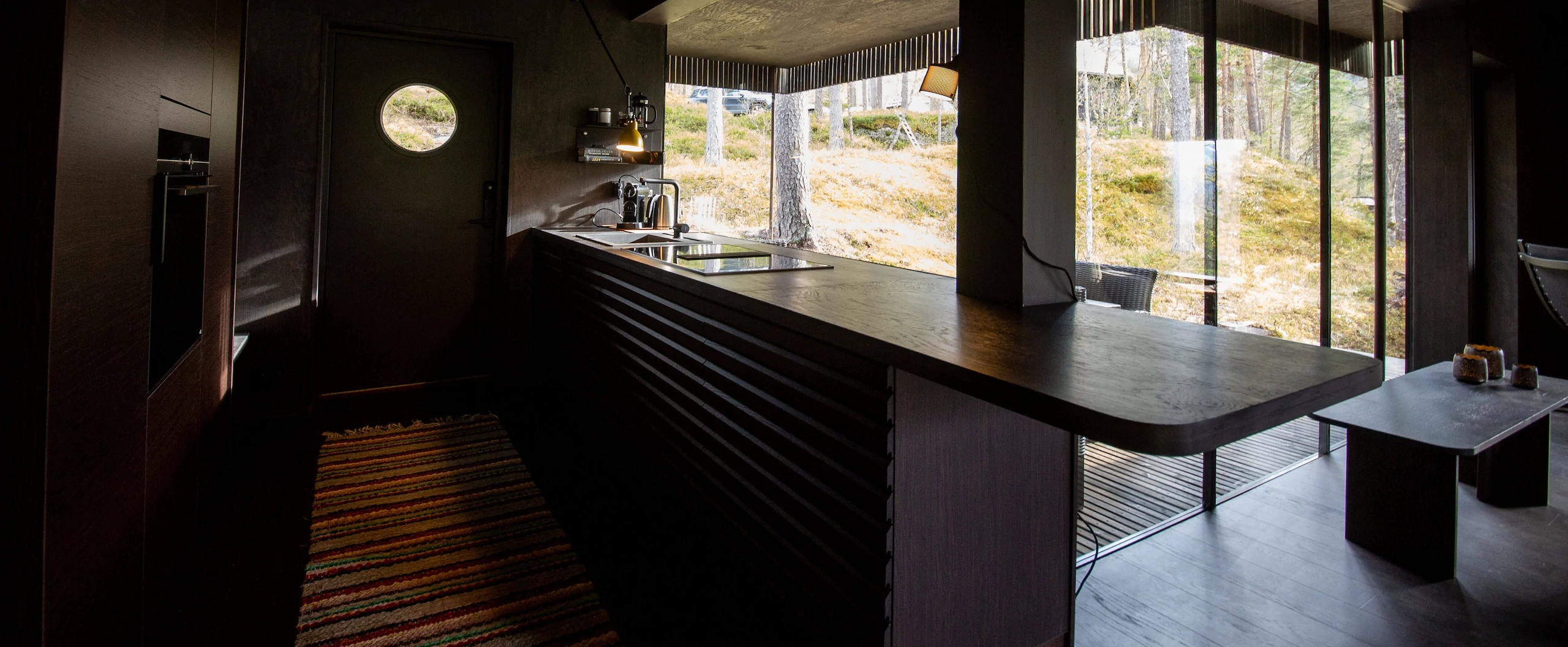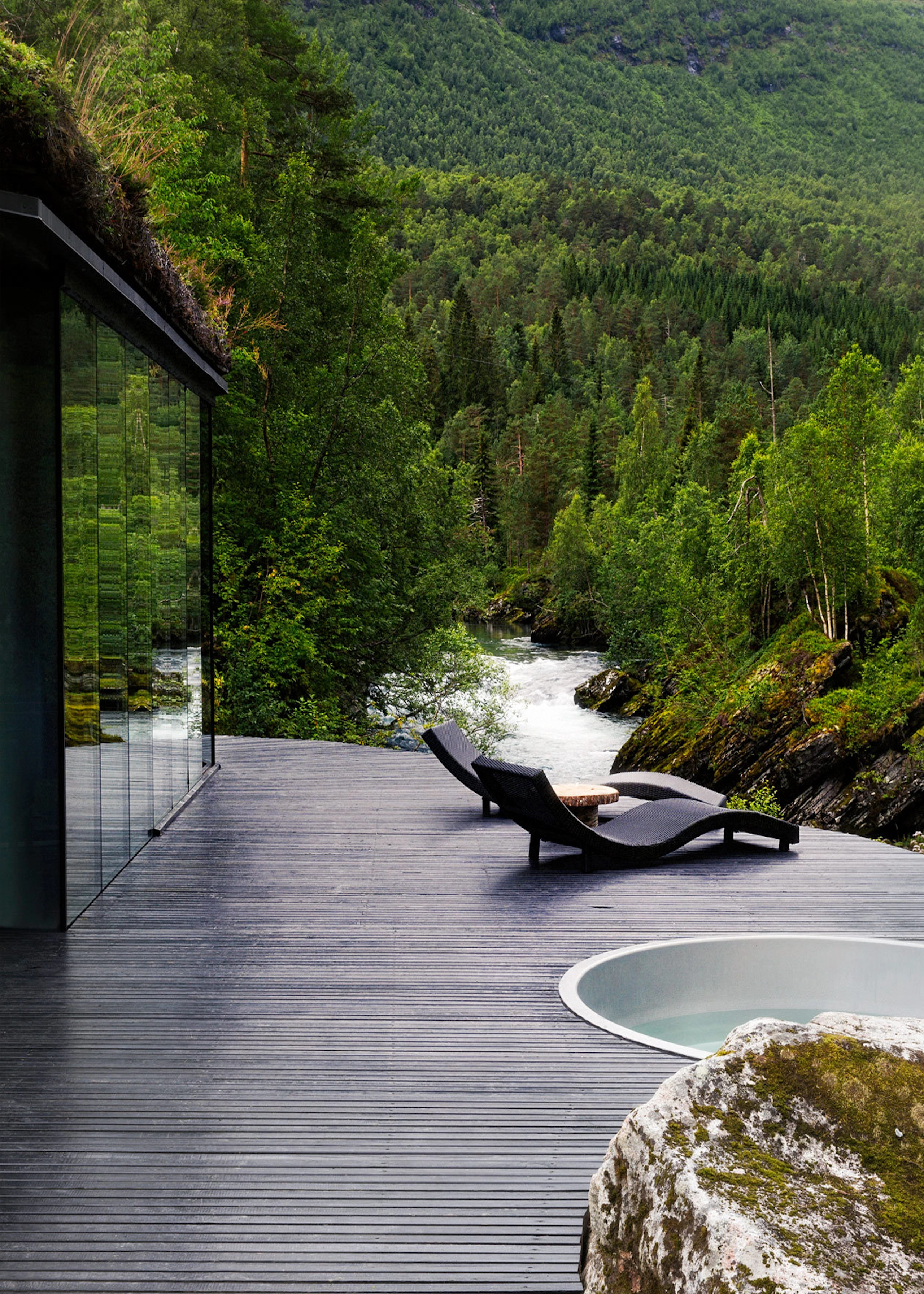 Writer’s Lodge is a "chalet" of 70 sqm (750 sqf) and contains two bedrooms with space for four people, living room, kitchen and a nice patio facing the forest. The view is framed by windows that serve as landscape paintings towards the valley, the river and the mountains. The large windows face the forest with birch and pine and with a beautiful forest floor with moss and blueberry heather.